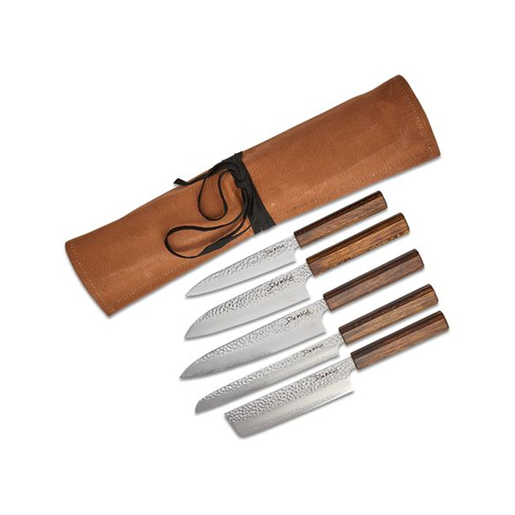 Traditional octagon Japanese Red Oak handles for: a comfortable, balanced grip Lightweight and hand-sharpened for: precision and control Includes 5 essential knives: Petty, Gyuto, Bread, Santoku, and Nakiri Comes with a Hudson Durable Goods brown waxed canvas roll for: safe storage Petty Knife: 6"" blade, 2mm spine, 11"" overall, 2.7 oz | Gyuto Chef Knife: 8"" blade, 2mm spine, 14"" overall, 4.8 oz