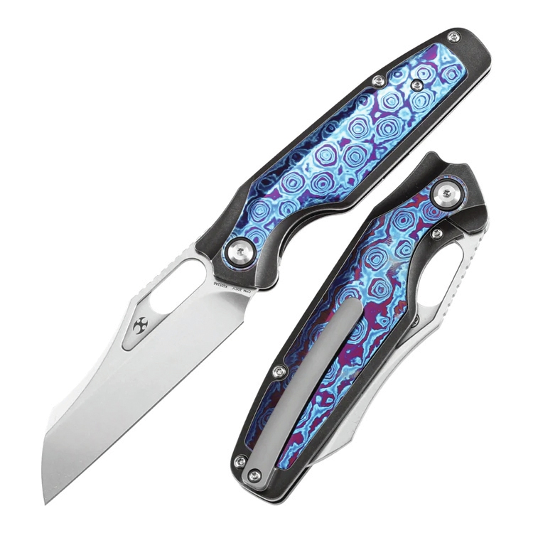 Premium Kansept Tuckamore folding tool. Features a 3.54-inch CPM 20CV steel sheepsfoot blade for precise utility. The blackwash titanium and Timascus handle offers a lightweight, ergonomic grip for all outdoor activities.
