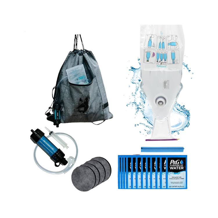 Includes Puribag: membrane filter straw kit, expansion pack, filter refill pack Comes with a stylish: drawstring carry bag for storage and transport Includes 12 Purifier: of Water sachets, each treating 10L of water." |