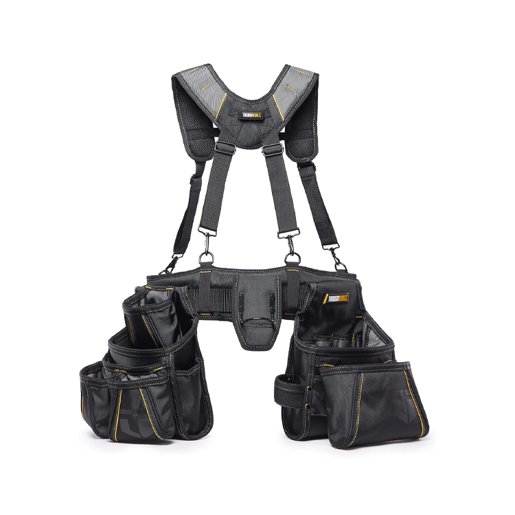 | Heavy-Duty: Secures tools with padded pouches, steel buckle, and reinforced points Jobsite-Ready: Structured pockets, padded belt, and suspenders for comfort Versatile: 25 pockets/loops, dual-ring hammer loops | Durable: 1680D fabric with rivet reinforcement USA Quality: Designed and tested in the USA |