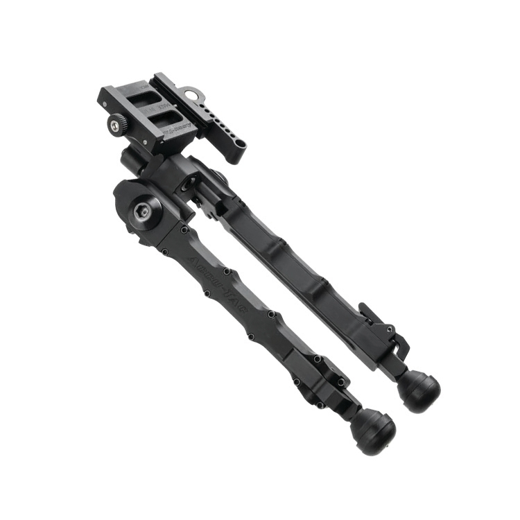 | Designed for secure attachment to ARCA rail systems for streamlined mounting. Constructed from billet 6061 T6 aircraft-grade aluminum for superior durability. Reinforced with high-strength steel hardware for dependable performance. Adjustable height range from 6.5” to 11” supports versatile positioning. Four leg-angle positions provide adaptable setup options. | Nine height adjustment settings allow precise elevation control. Adjustable stance from 9.25” to 15.75” enhances balance and stability. Independent leg positioning supports secure placement on uneven terrain. Canting capability locks firmly with an adjustable lever for consistent alignment. Finished in Flat Black with Type III MIL-SPEC hard anodizing for enhanced surface protection. |