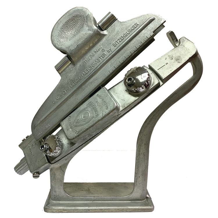 Professional Bitzenburger crossbow bolt fletching jig with a straight clamp. Made from zinc die-cast alloy for 22/64 diameter shafts. Features 120-degree indexing for 3-fletch spacing and precise vane placement.