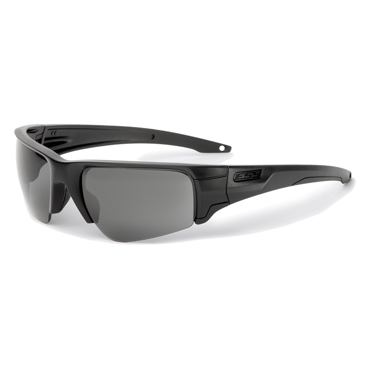 ESS Crowbar ballistic sunglasses with black frames, smoke gray lenses, and subdued logos. Features a frameless bottom for wide views, rapid lens exchange system, and MIL-SPEC protection. Helmet and comms gear compatible.