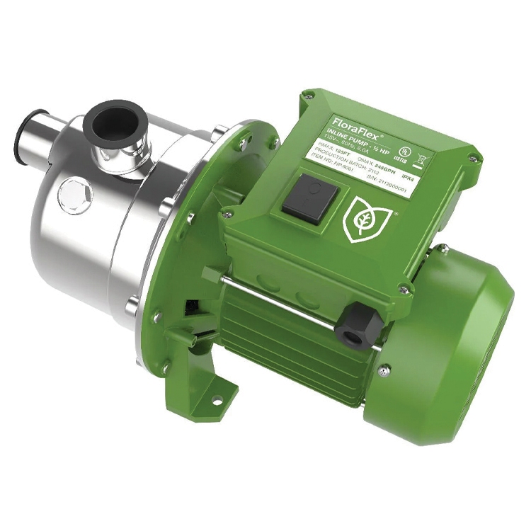 FloraFlex 1/2 HP Inline Pump: Efficient 115V irrigation pump delivering 960 GPH with 55.1 max PSI. Features a 125ft lift height, 1" NPT connection, and motor load protection. Reliable water transfer for your indoor garden.
