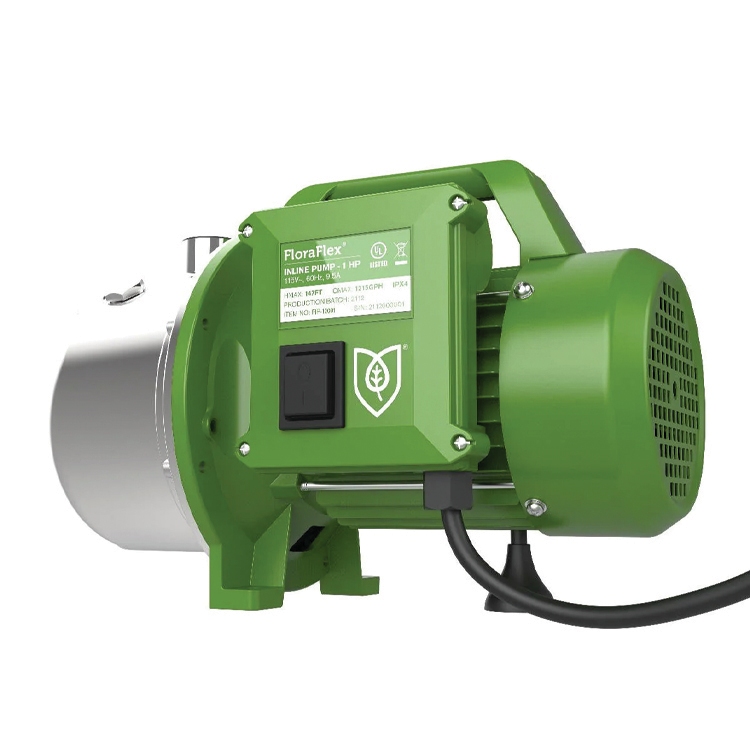 FloraFlex 1 HP Inline Pump: Powerful 115V irrigation solution with a 960 GPH flow rate and 55.1 max PSI. Features 125ft lift height, 1" NPT pipe diameter, and motor load protection. Perfect for efficient garden water transfer.