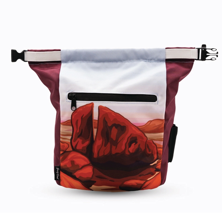 Durable Red Rock bouldering bucket for indoor and outdoor use. Features heavy-duty oxford fabric, fleece lining, and secure velcro closure. Includes two zippered pockets, brush holders, and an emergency whistle buckle.