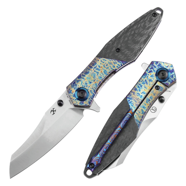 Exclusive Kansept Mistaken folding tool. Features a CPM 20CV blade with a Lightning Strike titanium finish and a Timascus clip. The carbon fiber handle and secure frame lock offer a premium feel for outdoor enthusiasts.