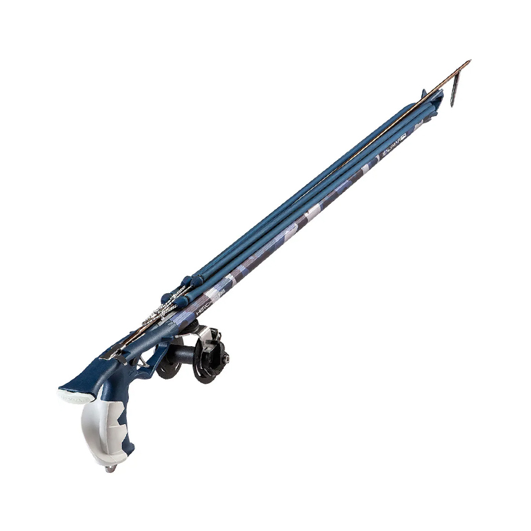 | Elliptical Barrel: Aircraft-grade aluminum alloy with improved hydrostatic trim. Teflon Shaft Guide: Low-friction integrated guide for maximum shooting accuracy. Heavy Metal 350: High-strength trigger mechanism tested to 772 lbs (350kg). Adjustable Trigger: Customize sensitivity for a personalized firing experience. Blue Camouflage: Permanent sublimation finish for stealth in blue-water hunting. | Pro-Grade Shaft: 7.5mm 174ph stainless steel capture shaft with 3 shark fins. Dual Power Bands: Equipped with twin 16mm x 70cm slings for high-velocity shots. Vertical 70 Reel: Durable nylon/Delrin spool with a 70m line capacity for big game. Versatile Muzzle: Open design for multiple bands with an optional bridge kit. Ergonomic Loading: Soft rubber chest pad ensures comfort during heavy loading. |