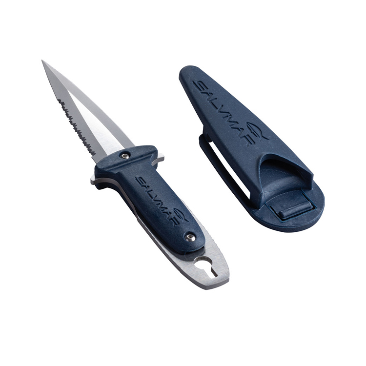 | Ultra-Compact: Minimalist profile ideal for streamlined freediving and hunting. 420 Stainless Steel: High-quality corrosion-resistant blade for aquatic use. Dual Edge Sharpening: Features both smooth and serrated edges for versatile tasks. Easy Release: Integrated locking device for quick and safe blade deployment. Versatile Mounting: Designed for secure attachment to the arm, calf, or belt. | Streamlined Sheath: Includes a custom scabbard for a total length of 16 cm. Spearfishing Ready: Specifically engineered for the needs of underwater hunters. Secure Fit: Reliable mounting options ensure the knife stays in place while diving. Tactical Blue Finish: Stylish colorway that stands out for quick identification. Durable Build: High-strength materials designed to endure harsh marine settings. |