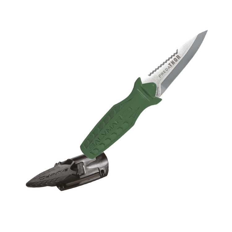 Elevate your dive with the compact Salvimar Predathor Diving Knife in Military Green. This 16cm tool features a 420-stainless steel blade with smooth and serrated edges, a quick-release device, and versatile mounting for your arm, belt, or calf. Perfect!
