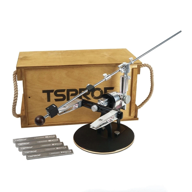 | Electronic Angle Finder: The Axicube-I measures sharpening angles in real-time with 0.1° accuracy for precise edge control. One-Hand Semi-Automatic Turning Mechanism: Flip knives safely while maintaining consistent angles with adjustable pressure and auto-locking. Stepless Angle Adjustment: Rack-and-pinion lift allows smooth angle changes from 10°–39° per side, with up to 78° total. Durable Aluminum Body: Made of 7075 T6 aircraft aluminum for vibration resistance and long-lasting reliability. Universal Whole-Milled Clamps: Securely hold a variety of knives—fixed, folding, kitchen, hunting, and utility—without calibration. | Flat-End or Backed Stone Support: Compatible with any abrasive stone up to 210 mm long, both backed and unbacked. High-Rigidity Steel Rod: Two-part rod with aluminum sleeve coupling ensures maximum alignment and stability. Complete Diamond Plate Set: Includes five plates (F150–F1000) for profiling, sharpening, pre-finishing, and mirror polishing. Supports Large Blades: Accommodates blades 60–450 mm long and up to 7 mm thick for professional use. Professional Full-Size System: Engineered for serious sharpeners seeking precision, stability, and consistent results. |