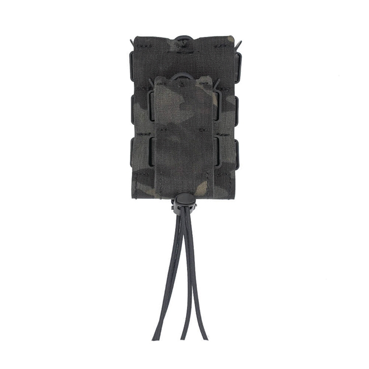 The Urban Assault Stacked Pouch in MultiCam Black combines rifle and pistol carriers into one unit. It uses independent bungee retention for security and attaches via Fight Light Malice Clips. It also securely fits select radios and flashlights.